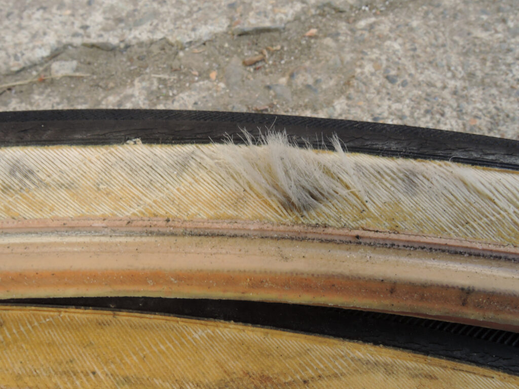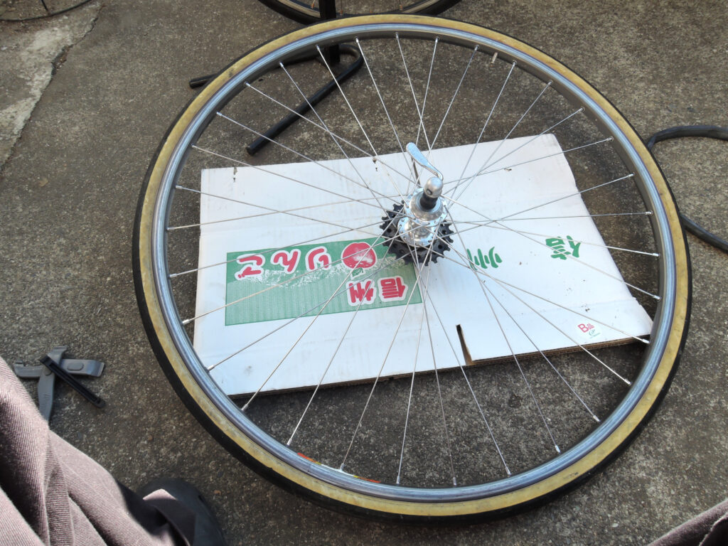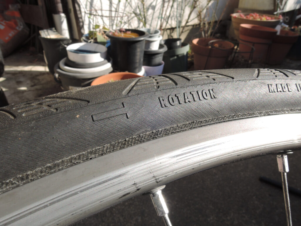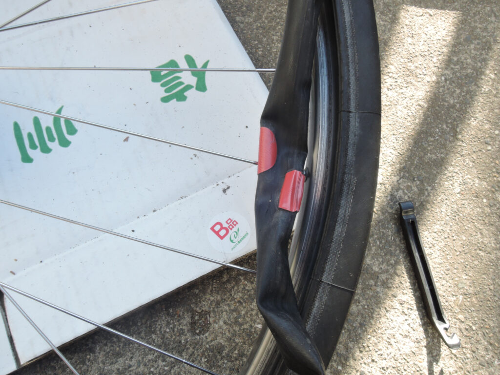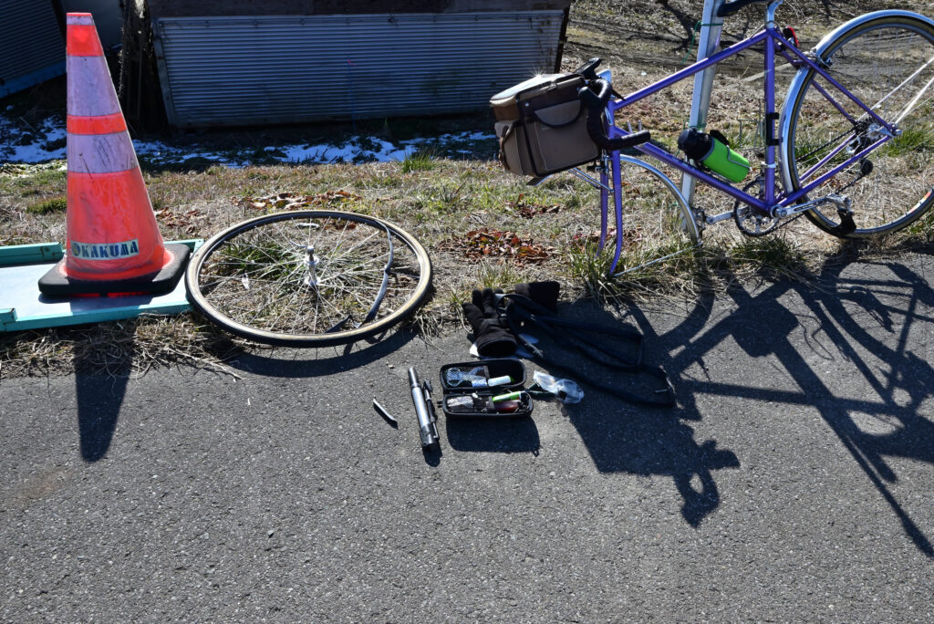 邪魔にならない場所を探し、作業開始。ビードにタイヤレバーが中々掛からない。何とかタイヤを外し、チューブを引き出すも固着していて出てこない。奮闘しているなか原因の異物をタイヤ表面に発見。手で摘まんだが落としてしまい、視力低下の目では発見が困難、諦める。
