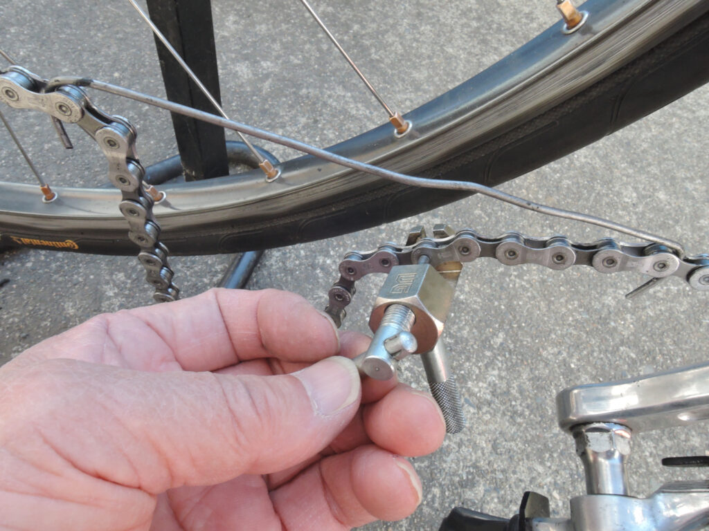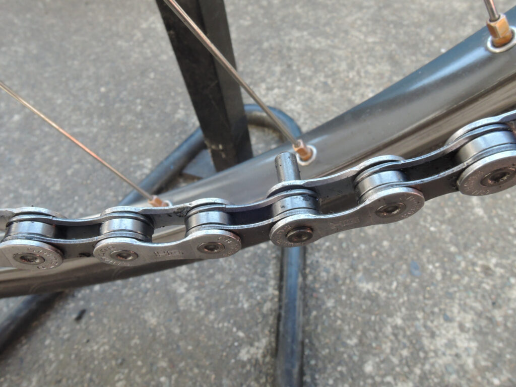 原因の特定ができないまま、点検、増し締め等をしては、試走を繰り返していると、ガシャ。。ペダルが一気に下降、バランスを崩す、一瞬何が起きたか戸惑うがチェーン切れと直ぐ気付く。ピッキ、ピッキ異音の原因が判明。