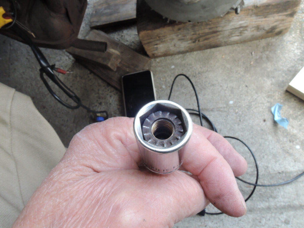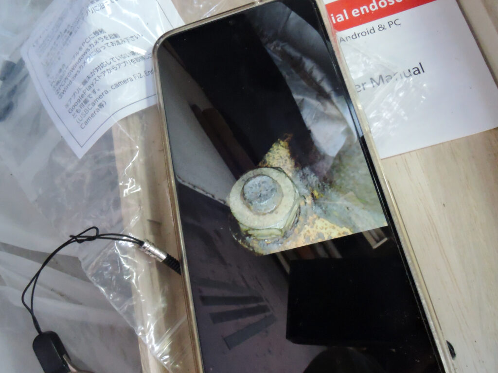 ここからファイバースコープの登場。ファイバースコープでナットを探し、ソケットを嵌め込み、ファイバースコープは撤退。ソケットレンチでナットを締め上げる。ファイバースコープの先のLED照明だけではうまく対象物を捉えるのが難しい。下から電灯でで照し全体を明るくすると対象物を捉え易くなった。成功です。
