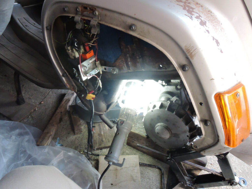 さて、マフラー焼きを終えて取り付け作業にかかる。兎に角VESPAは狭い空間にギッシリ詰め込んであって何をするにもアクセスが悪い。マフラーも例外にもれず暗中模索しながら悪戦苦闘を2日間。隙間に手を突っ込み何とかマフラーをエンジンに取り付け、固定ネジまで付けた。固定ナットの締め付けはソケットレンチでやるしかない。が、ソケットが中々ナットに篏合しない。お手上げ状態。